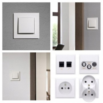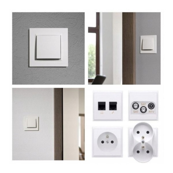 - Czterostopniowe zatrzaski na każdej ramce zapewniają równe przyleganie ramek do nierównych ścian. Również zamontowane w puszkach do ścian karton-gips nie powoduje odstawania osprzętu Simon 10 od ściany.