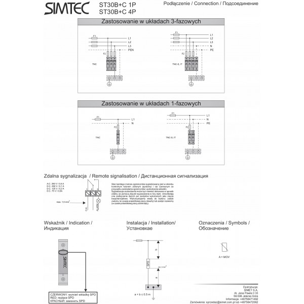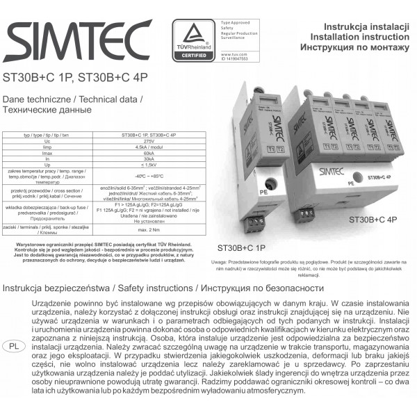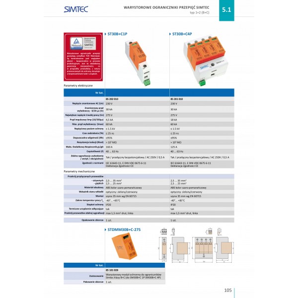 Ogranicznik przepięć B+C Typ 1+2 4P 30kA 275V SIMTEC ST30B+C Typ 1+2 4P 85201010